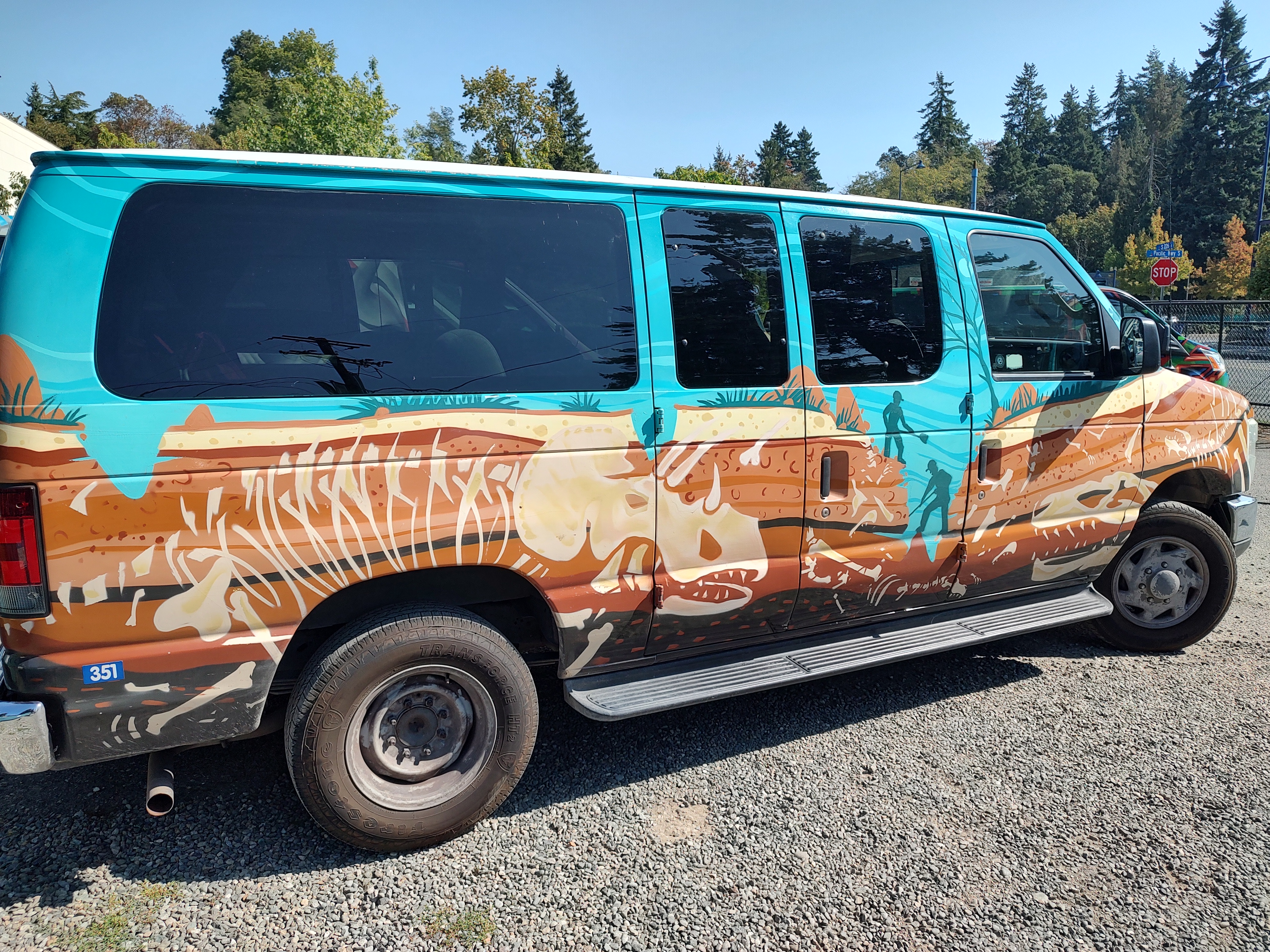 Our van was named “Bones”. It was an older Ford E-Series van with 387-thousand miles on it when we started. Its upper surfaces were sky blue, with maybe a turquoise slant, and the lower half showed a cutaway of the earth, chock full of dinosaur bones. Our van was covered with with the skeletons of several theropod dinosaurs (e.g. T-Rex, Velociraptor/Deinonychus) and an obvious triceratops. On one side, several paleontologists were digging cleanly between the fossils, finding nothing. On the other, a dog was happily burying new bones into the mix. Not only did we never have a problem finding our car in a parking lot, we always got happy smiles and thumbs-up from others wherever we went.