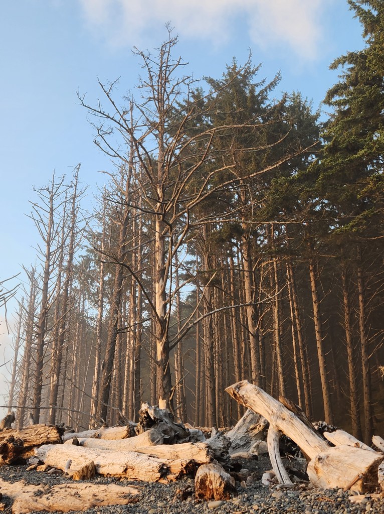 Before the sun set completely, we made our way back south along the beach and jumped back into Bones for the final drive of the day, a short hop over to Mora Campground, where we could still hear the surf and smell the salty mist in the air while camping under the large spruces and hemlocks.