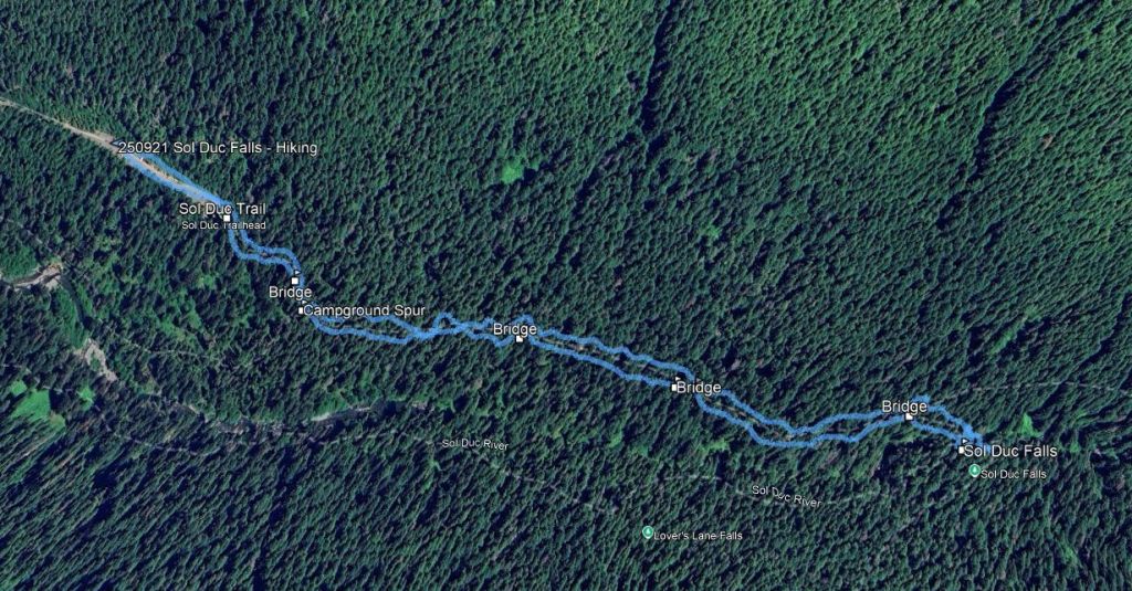 This was another trail (like at Marymere) where the trail and the river didn’t really coexist for a long time. In fact it wasn’t obvious that we were following a river upstream, but then at the falls the two suddenly converged, and the trail crossed a bridge just below the falls, and just above a narrow rocky gorge. The falls themselves are interesting, in that there are three primary jets of water that flow left to right into a gorge that runs at right angles to it – in other words the flow hits the gorge and makes an immediate right turn to flow downhill through the gorge. It really is pretty, but the actual drop is only about 40 feet.