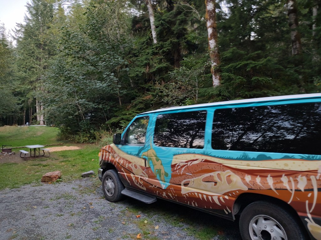 Beach days must come to an end, however, so eventually we climbed back aboard the campervan and headed east. We cut back east toward Rainier and enjoyed the transition out of the Olympic mountains. For some reason (it was a Monday?) it appeared that EVERY bridge on the Olympic peninsula was under construction. Each one was down to just one lane, with long waits at many of them. We presumed that road crews were racing time, trying to get everything done before snow season. But hey, we didn’t really have anywhere to be, so long as we got to our new campground at a reasonable time.