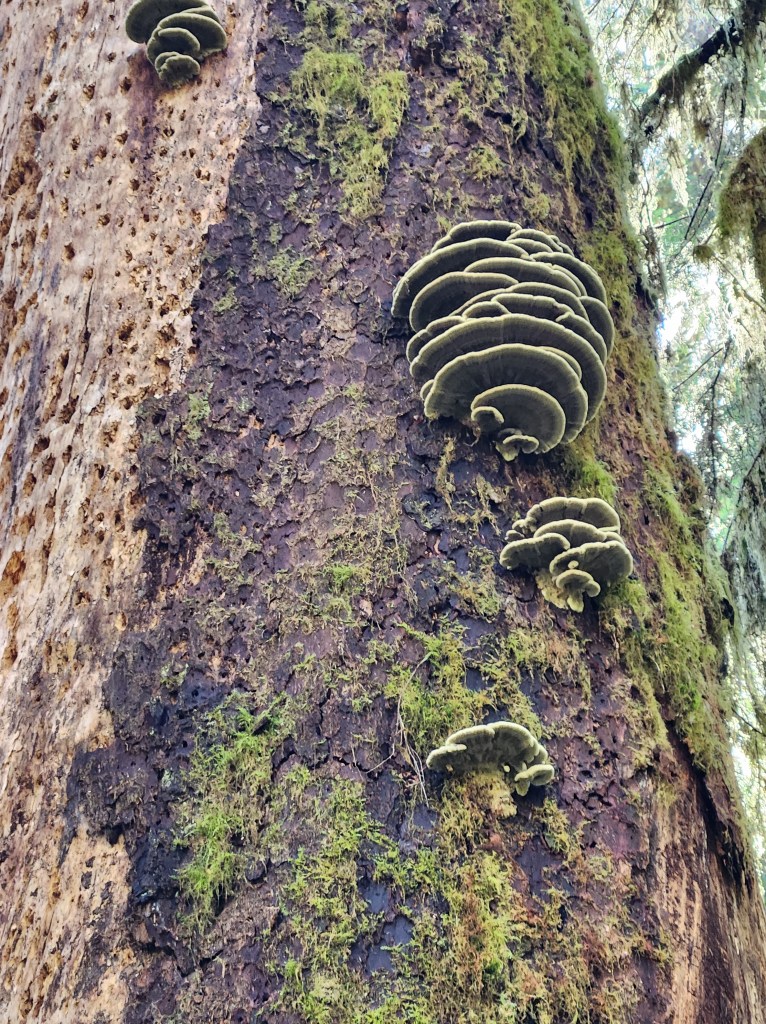 As an example, we learned about nursery logs. Every surface here seems to be covered with vegetation. The ground is full of ferns and low shrubs, but the elevated surfaces here – downed trees, rocks, stumps and root balls of fallen trees – are covered with young saplings. As it turns out, these elevated surfaces are the ONLY locations where saplings can grab a foothold. Down among the ferns, there’s no light and too much competition. But when a giant spruce, hemlock or fir tree goes down, suddenly there’s an elevated perch with deep channeled bark in which a sapling can establish a footing.
