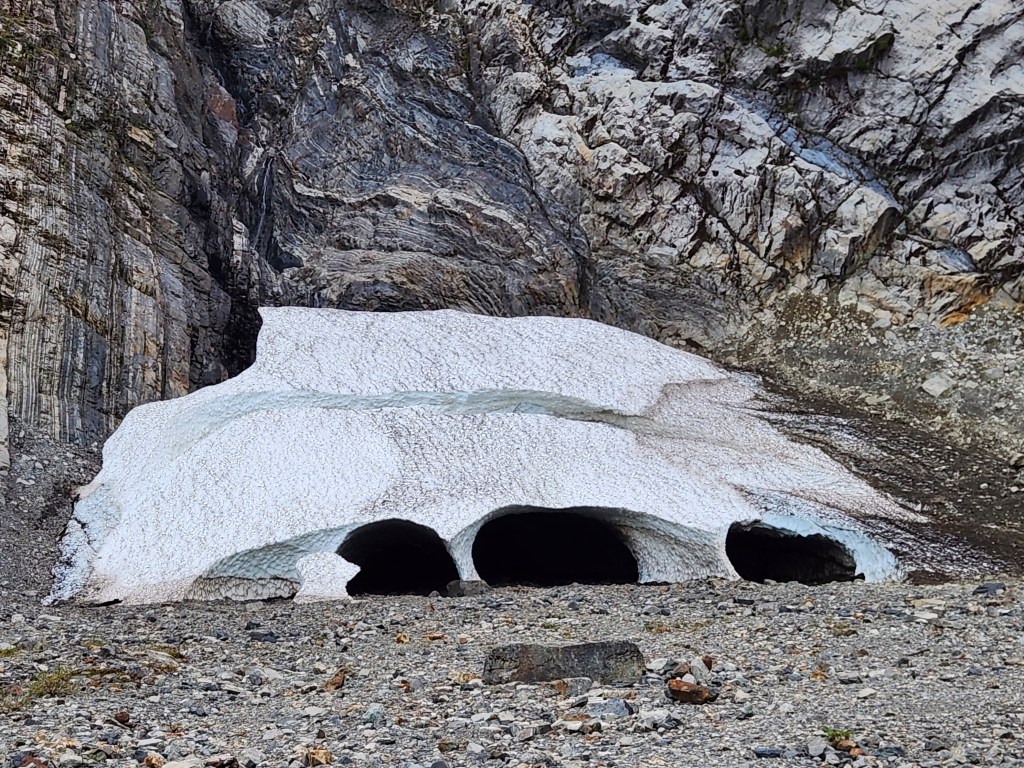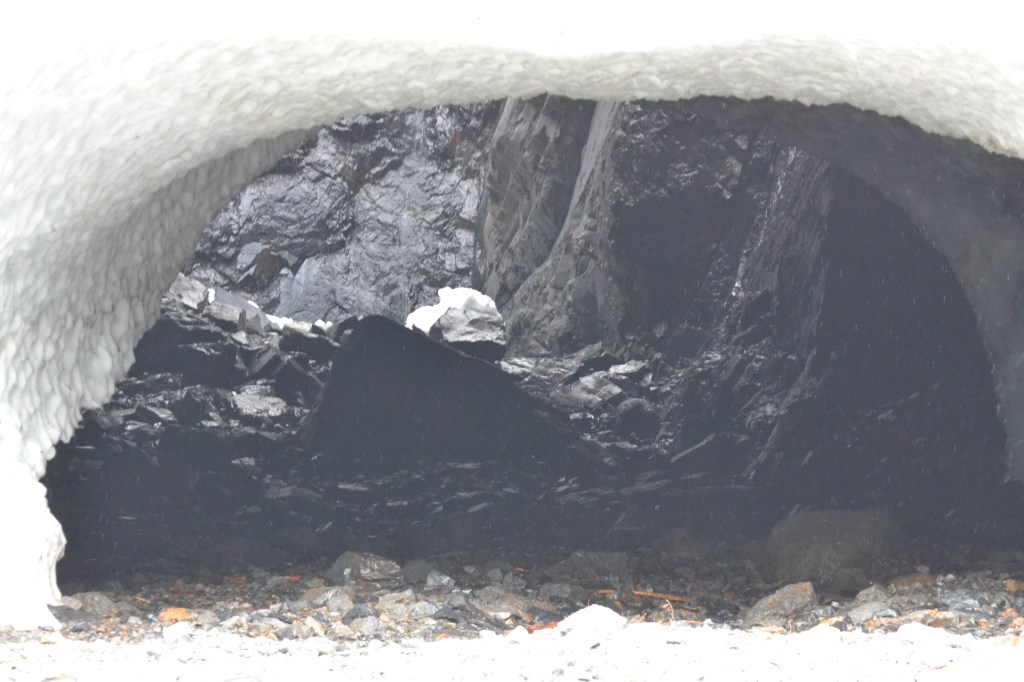 In reality, this is a pretty dangerous place. Hazards include: Falling snow (not concerning at this time), falling rocks (quite possible), and collapsing caves. Several signs are posted around warning that people die here trying to get too close. We had no intention of being crazy enough to go into the caves, but we established what we thought would be a safe distance away in case of a collapse, and moved forward to that point, still about 100 feet away from the ice. (Interestingly, when we looked at our GPS track later on Google Earth, the spot where we stopped was inside the snowfield based on photos taken in July!)