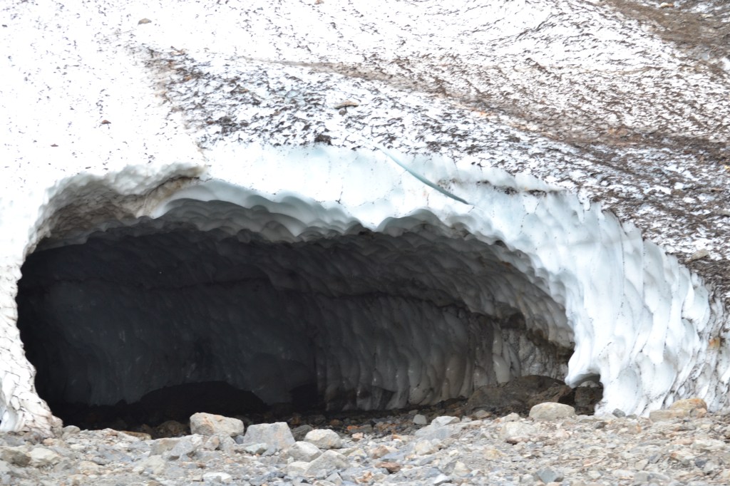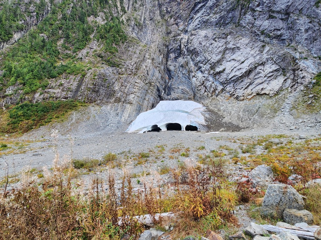 After a short passage through the underbrush, we emerged into a rocky scree field facing the cliff. There at the bottom of the cliff – in late September – was an enormous pile of snow and ice with several subway-sized tunnels carved into it. This time of year, the ice and caves are at their smallest, but in a week or so, they’ll start to grow again.