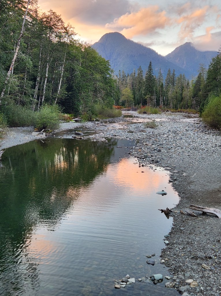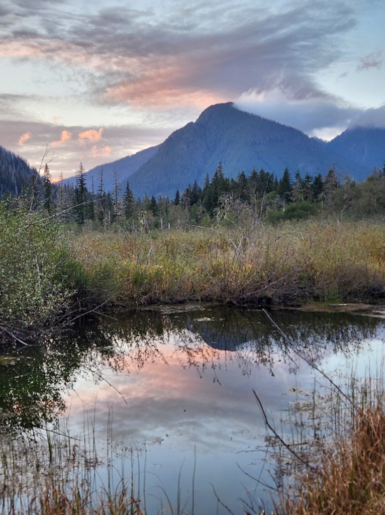 As it turned out, we hit the sunset jackpot. The clouds were dramatic, the surrounding peaks were red-gold in the sunset glow. The Stillaguamish reflected the pinks and reds of the darkening sky. And instead of walking back the same way we’d come, we elected to take the boardwalk out through the marsh adjacent to the old site of the Big Four Inn that used to stand here. The walk out into the wetland turned out to be a great choice, as it offered even better, unobstructed views of the mountains illuminated by sunset. A beautiful way to end the outdoor portion of this entire journey.
