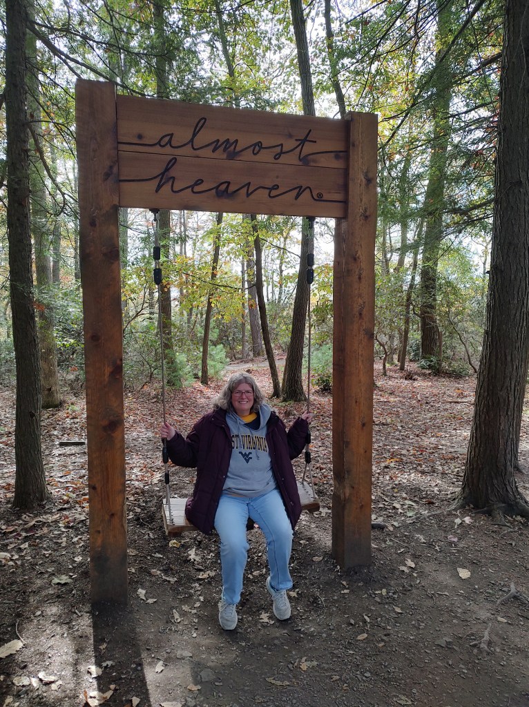 Saturday, we settled more into camp before going out and finding a grocery store. We didn’t really have a plan yet, since we were also set to meet extended family for the evening football game, and weren’t yet sure what our tailgate plans would be. When we found out they were arriving late and having dinner on the road, we decided to “tailgate” with our son at the campground. We visited the downtown farmer’s market for inspiration, stocked up on food, and then went back to camp. We also made a brief morning excursion out to the Cooper’s Rock viewing area. We didn’t linger here – lots of other people around – but got a sense of the colors in the trees, and also found that Cooper’s had installed one of those “Almost Heaven” swings that are popping up at various West Virginia parks. My wife had to give it a try.