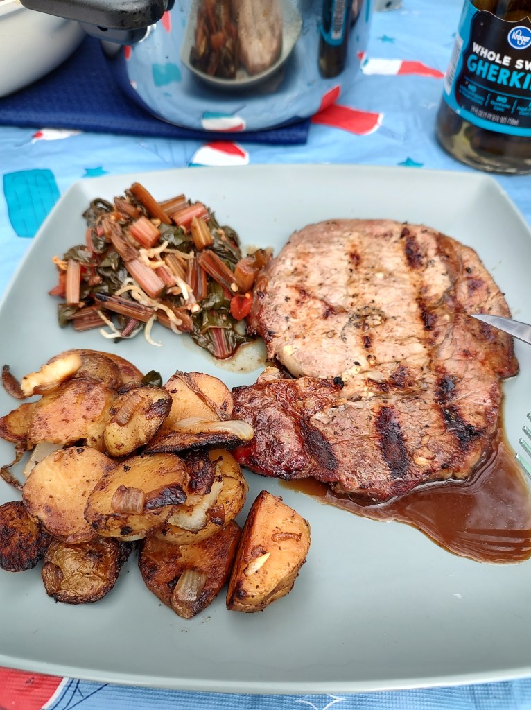 Before too long, we got a text that our son was on the way, so we started getting the fire going and prepping for a late lunch. He arrived just in time for the fire to be hot and ready. We wound up doing ribeye steaks and chicken kabobs grilled over a wood fire, and roasted potatoes with onions and swiss chard on the trailer cooktop. The food was outstanding, but the company and conversation around the simple task of cooking on a fire was even better.