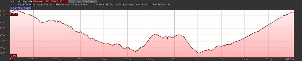 The trail starts across the road (on the south side) from the trailhead parking lot. Take note, though – there’s a new road here cut to provide access to the cabin camping area. This leaves an obvious trail – the McCollum Trail – visible from the road, but this is NOT the one you want to take you to Raven Rock. The Raven Rock Trail is just a little bit down the cabin access road, where it obviously splits off to the right. If you do miss this, don’t worry – we made this same mistake. The two trails parallel each other for a bit, and if you wander down McCollum you can take your first left and re-join the Raven Rock Trail without a lot of extra distance. And this part of the McCollum Trail is nice too. (Our mistake explains the little loop in the north end of the trek on the map below).