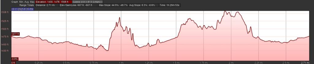 In order to add some distance, we continued past the falls, up the Cove Mountain Trail for a bit, before turning back and doing the entire Fighting Creek Nature Trail loop. This loop is also easy, but it does climb gently up the valley , resulting in a little more elevation change than the flat trail to and from the falls. All told, we turned this short out-and-back into a 2.7 mile trip.