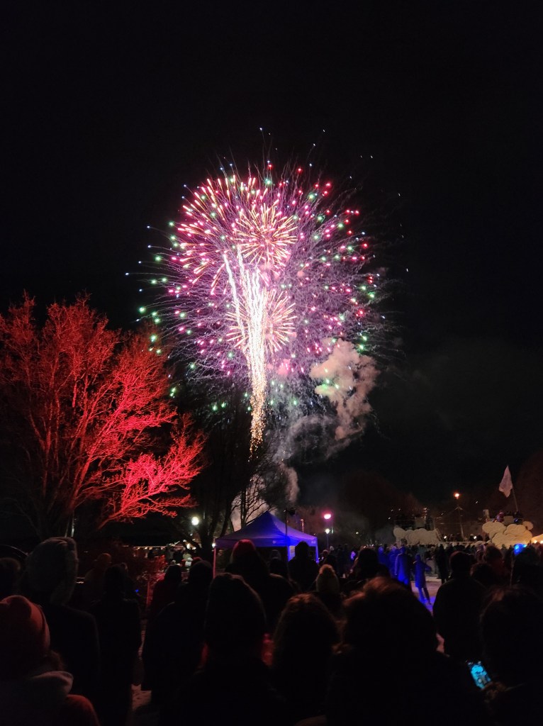Eventually we settled down near Champ to watch the New Year’s fireworks at 8pm, for a family-friendly celebration. Events are 21+ after 9pm, but we were happy for the early celebration. It was cold, and we had an hour and a half to drive to get to our lodging in Stowe! The fireworks weren’t anything particularly special, but they were fun, and pretty, reflecting off the lake.