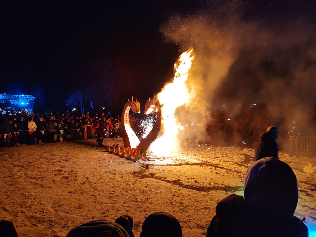 Then, the main event – a woman emerged from the crowd and walked through the snow spinning torches as if she were a Polynesian fire dancer. A man spit fire across another torch, or from one of hers, throwing fireballs toward Champ/Chessie, until they ignited! On one level, it was a shame – a lot of craftsmanship had obviously gone into the construction of these creatures. They would have been at home on the prow of a pair of Viking longships. On the other hand, we were there to see them BURN!!