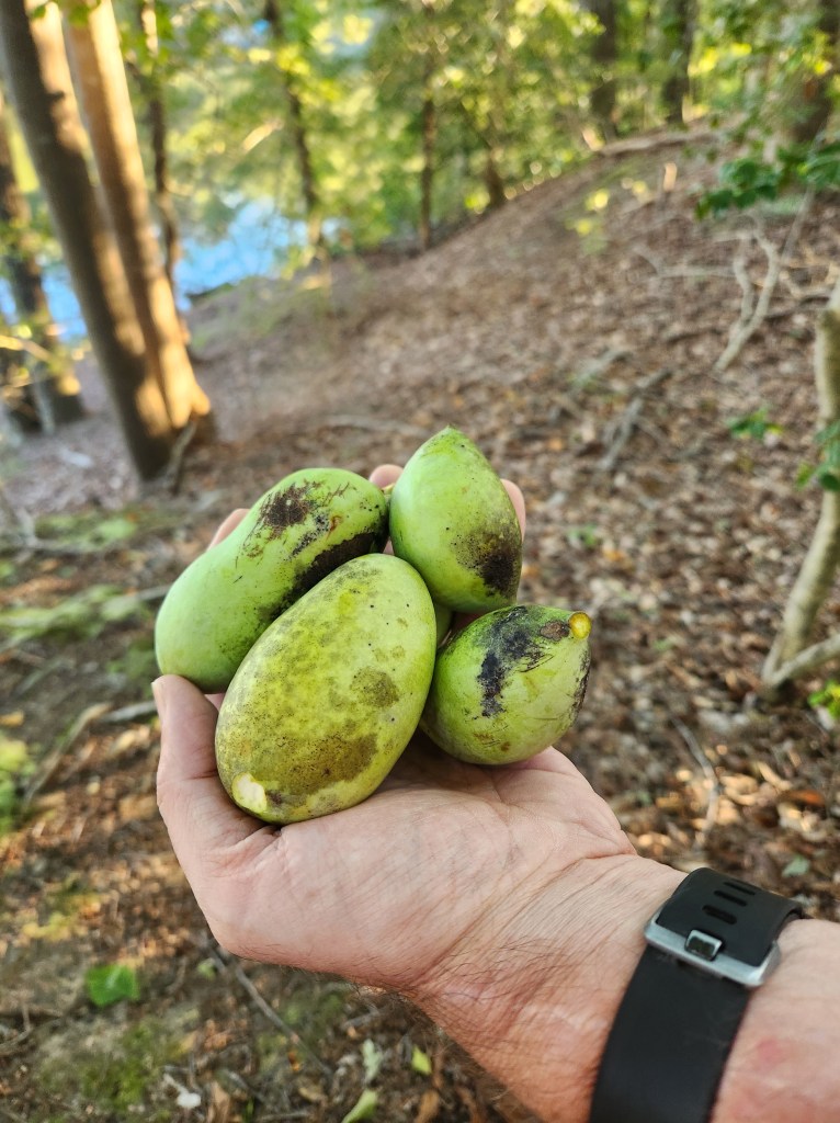 I just want to point out that paw paws are starting to become edible here in Maryland! These trees have a habit of having their fruit get ripe at wildly differing times, so you can find rotten paw paws and hard-as-a-rock unripe ones hanging right next to each other… but today I started finding some just slightly soft enough to take a chance on harvesting them. Good eating awaits!