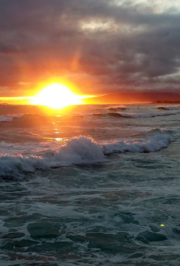 I do love the snow, but memories of the tropics are great too! I liked the way the setting sun shone through the spray off the waves at Waikiki Beach.